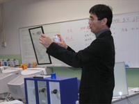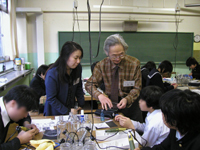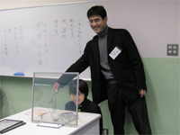 日本板硝子(株) 中井日出海講師 (新宿区立大久保中学校) 最近注目を集める防犯ガラス。 割れにくさを 実演で伝える。 |