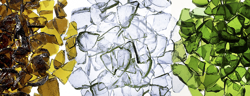 細かく砕かれてカレットとなり、何度でもガラスびんにリサイクル(水平リサイクル)されるワンウェイびんのシンボルマーク。 |