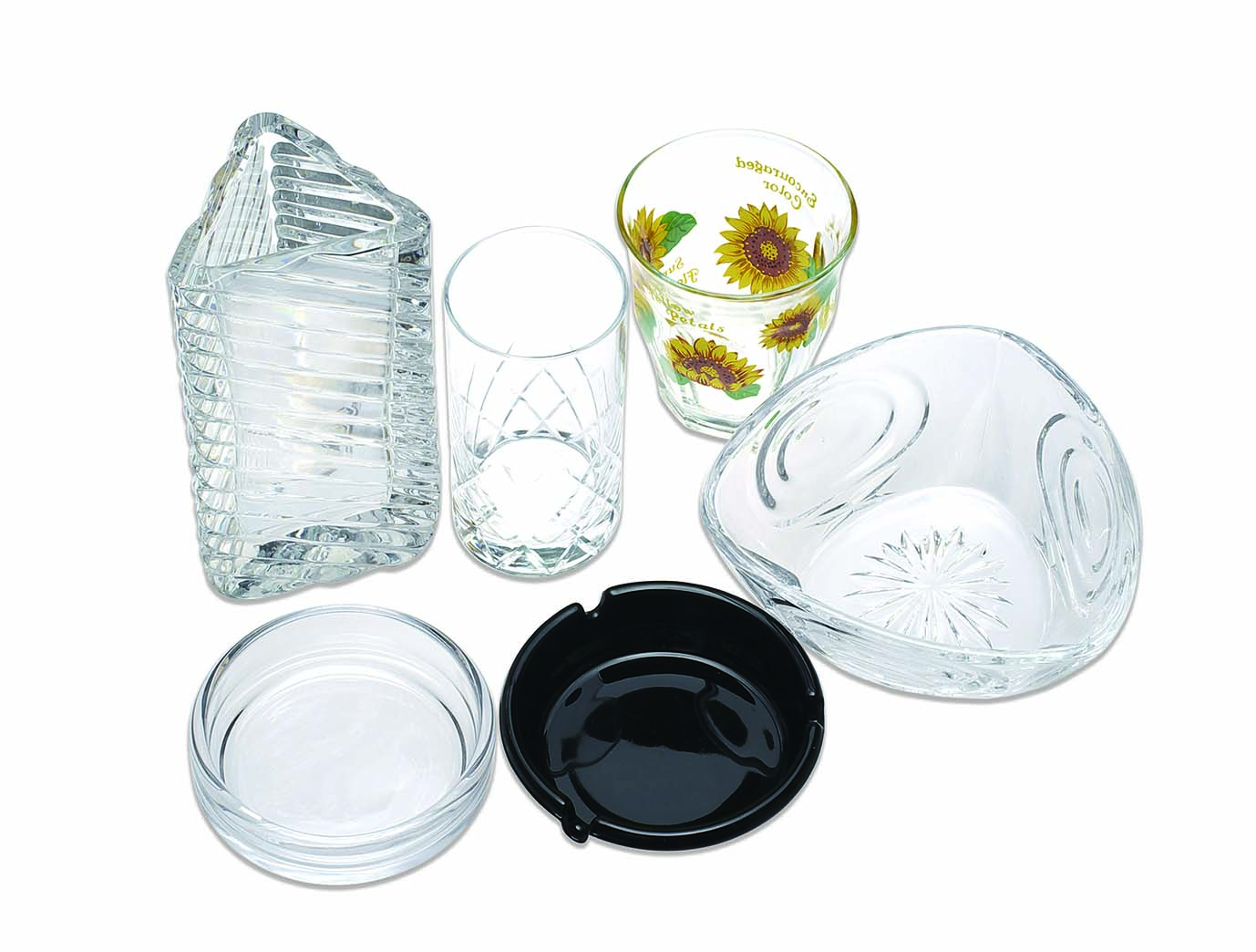 | ガラス食器 | ソーダ石灰ガラスも多く使われているが、クリスタルガラスや強化ガラスなども使われているため見分けにくい。![]() |