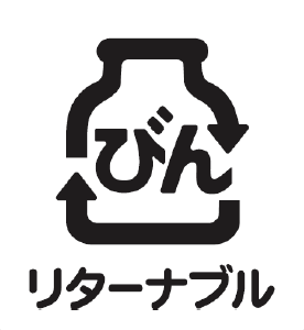 ガラスびんは内容物の香味や色が吸着(きゅうちゃく)しないため、リユースに適(てき)している。使用後は洗浄(せんじょう)され、くり返し使用されるリターナブルびんのシンボルマーク。 |