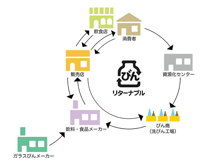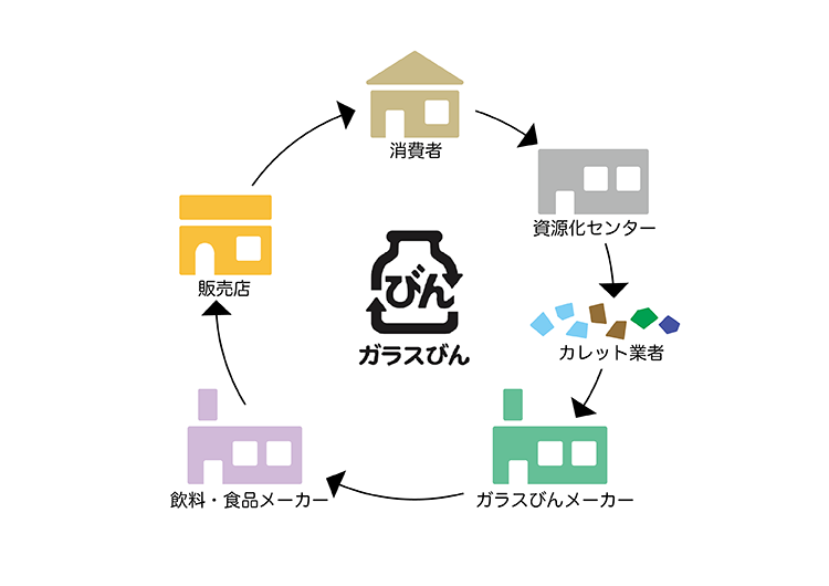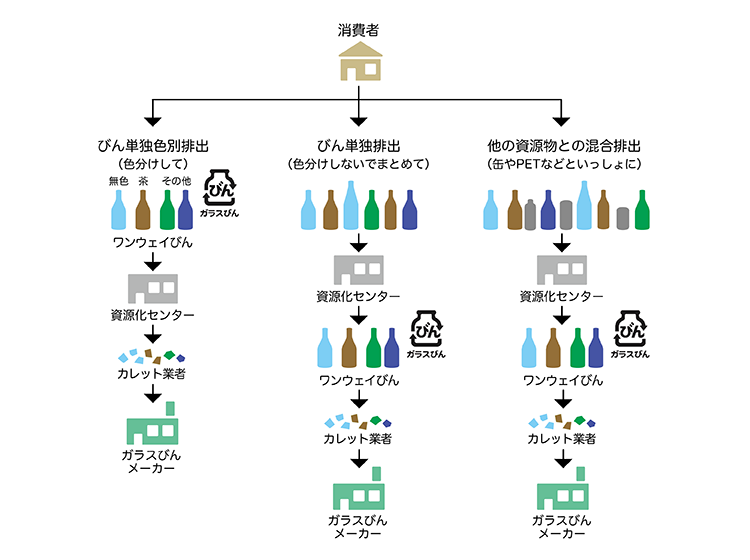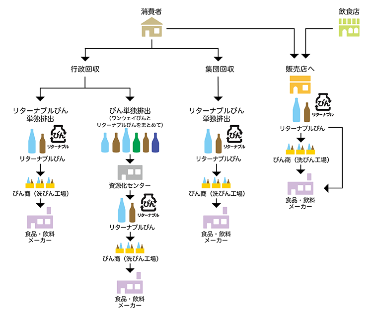 ※一部の自治体では、空きびんの品質を維持(いじ)した状態で回収(かいしゅう)し、その中からリターナブルびんを選別して再使用につなげているケースもあります。また、リターナブルびんの回収日を定めているケースもあります。