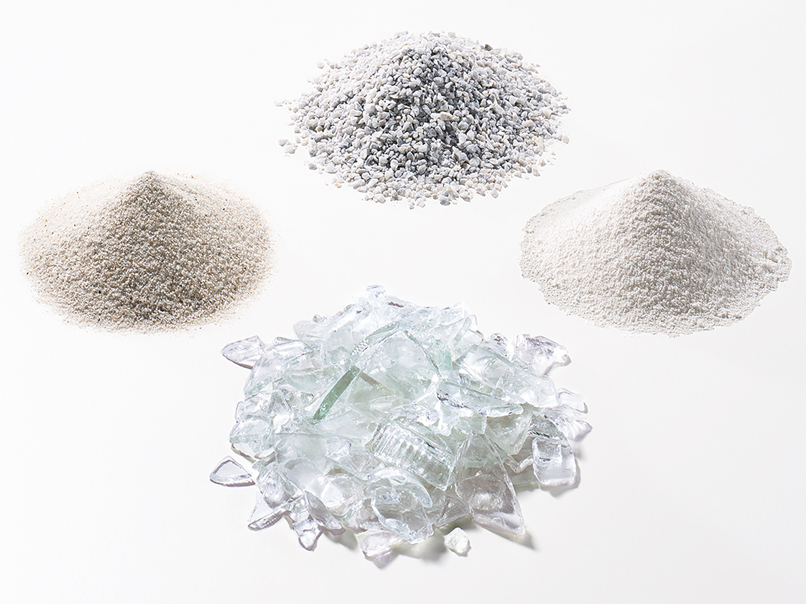 | 原料 | けい砂、石灰石、ソーダ灰、カレット(左から時計回りに)![]() カレット(茶、無色、その他色)